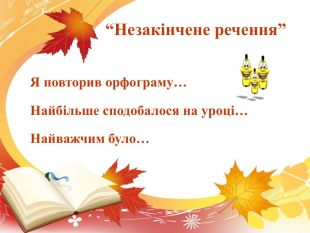 “Незакінчене речення” Я повторив орфограму… Найбільше сподобалося на уроці… Найважчим було…