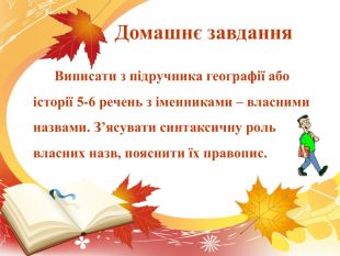 Домашнє завдання Виписати з підручника географії або історії 5-6 речень з іменниками – власними назвами. З’ясувати синтаксичну роль власних назв, пояснити їх правопис.