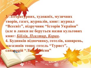 3. Літературних, художніх, музичних творів, газет, журналів, книг: журнал “Всесвіт”, підручник “Історія України”(але в лапки не беруться назви культових книг: Біблія, Псалтир, Коран.4. Будинків відпочинку, готелів, кавярень, магазинів тощо: готель “Турист”, санаторій “Лісова пісня”