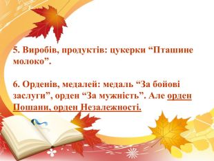 5. Виробів, продуктів: цукерки “Пташине молоко”.6. Орденів, медалей: медаль “За бойові заслуги”, орден “За мужність”. Але орден Пошани, орден Незалежності.