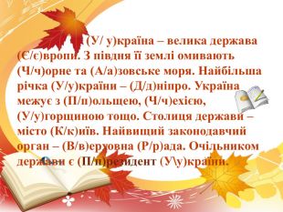 (У/ у)країна – велика держава (Є/є)вропи. З півдня її землі омивають (Ч/ч)орне та (А/а)зовське моря. Найбільша річка (У/у)країни – (Д/д)ніпро. Україна межує з (П/п)ольщею, (Ч/ч)ехією, (У/у)горщиною тощо. Столиця держави – місто (К/к)иїв. Найвищий законодавчий орган – (В/в)ерховна (Р/р)ада. Очільником держави є (П/п)резидент (У\у)країни.