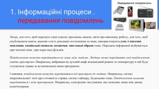 Інформаційні процеси .передавання повідомлень. Люди, для того, щоб передати один одному прохання, накази, звіти про виконану роботу, для того, щоб опублікувати книги, наукові статті, рекламні оголошення та інше, використовують усне й писемне мовлення, спеціальні символи, позначки, мистецькі образи тощо. Передача інформації відбувається при читанні книг, при перегляді фільмів. Повідомлення можуть передаватися не лише між людьми. Людина може передавати свої повідомлення навіть пристроям. Наприклад, вибравши на духовій шафі відповідний режим та температуру в ній буде готуватися страва за встановленою вами програмою.І навпаки, повідомлення можуть передаватися від пристрою до людини. Наприклад, сигнал мікрохвильової печі про готовність страви, сигнал таймеру, будильник тощо. Повідомлення можуть передаватися і між пристроями. Наприклад, електронне листування, яке можливе лише між двома комп'ютерами. Передавання повідомлень здійснюється обов'язково між двома об'єктами: передавачем (джерело повідомлень) і приймачем. Між ними діє канал передачі інформації — інформаційний канал (канал зв'язку).