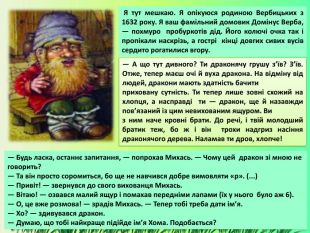 Я тут мешкаю. Я опікуюся родиною Вербицьких з 1632 року. Я ваш фамільний домовик Домінус Верба, — похмуро пробуркотів дід. Його колючі очка так і пропікали наскрізь, а гострі кінці довгих сивих вусів сердито рогатилися вгору.— А що тут дивного? Ти драконячу грушу з’їв? З’їв. Отже, тепер маєш очі й вуха дракона. На відміну від людей, дракони мають здатність бачити приховану сутність. Ти тепер лише зовні схожий на хлопця, а насправді ти — дракон, ще й назавжди пов’язаний із цим невихованим ящуром. Ви з ним наче кровні брати. До речі, і твій молодший братик теж, бо ж і він трохи надгриз насіння драконячого дерева. Наламав ти дров, хлопче! — Будь ласка, останнє запитання, — попрохав Михась. — Чому цей дракон зі мною не говорить? — Та він просто соромиться, бо ще не навчився добре вимовляти «р». (...)— Привіт! — звернувся до свого вихованця Михась.— Вітаю! — озвався малий ящур і помахав передніми лапами (їх у нього було аж 6).— О, це вже розмова! — зрадів Михась. — Тепер тобі треба дати ім’я.— Хо? — здивувався дракон.— Думаю, що тобі найкраще підійде ім’я Хома. Подобається?
