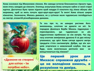 Хома оселився під Михасевим ліжком. Він завжди встигав блискавично пірнути туди, коли хтось заходив до кімнати. Хлопець влаштував йому затишне кубло зі своєї старої куртки. Достатньо було трохи підняти край ковдри й покотити під ліжко яблуко або морквину, щоб за мить почути хруп-хруп-хруп-хруп! Та вночі Хома вільно ширяв кімнатою. Засинаючи, Михась дивився, як у сутінках мале чудовисько погойдується на люстрі, оповитій різнобарвними димами. Та ось про те, як швидко ростиме його вихованець, хлопчик не думати не міг. За порадою Домінуса Верби Михась підрахував і пересвідчився, що чудовисько за рік підростатиме приблизно на сім метрів. Час від часу хлопчик вимірював дракона й за два місяці упевнився, що зріст Хоми сягнув одного метра тридцяти п’яти сантиметрів. Добре, що він хоч умів згортатися в невеличкий клубок. Але що буде, коли велетенська рептилія вже не вміщатиметься під ліжком?«Дракони не створені для кліток – їм потрібне небо». Це перший урок для Михася: справжня дружба – це не володіння кимось, а розуміння та довіра.