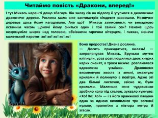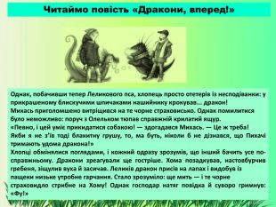 Яких фантастичних істот почав бачити хлопець? У чому полягають їхні чарівні властивості?З якими героями повісті «Дракони, вперед!» ви познайомилися?Дайте відповіді на питання. Що ви можете розповісти про Михася та його родину?Яка незвичайна пригода сталася із Михасем?Визначте, які казкові персонажі є у творі? Які чарівні перетворення відбуваються?Згадайте, що таке інтрига. У чому полягає інтрига в повісті К. Штанко «Дракони, уперед!»?