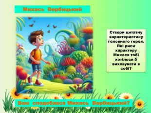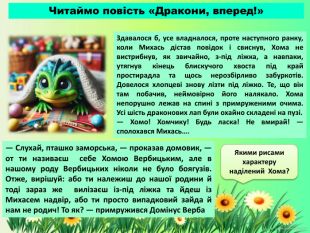 Здавалося б, усе владналося, проте наступного ранку, коли Михась дістав повідок і свиснув, Хома не вистрибнув, як звичайно, з-під ліжка, а навпаки, утягнув кінець блискучого хвоста під край простирадла та щось нерозбірливо забуркотів. Довелося хлопцеві знову лізти під ліжко. Те, що він там побачив, неймовірно його налякало. Хома непорушно лежав на спині з примруженими очима. Усі шість драконових лап були охайно складені на пузі.— Хомо! Хомчику! Будь ласка! Не вмирай! — сполохався Михась…. Читаймо повість «Дракони, вперед!»— Слухай, пташко заморська, — проказав домовик, — от ти називаєш себе Хомою Вербицьким, але в нашому роду Вербицьких ніколи не було боягузів. Отже, вирішуй: або ти належиш до нашої родини й тоді зараз же вилізаєш із-під ліжка та йдеш із Михасем надвір, або ти просто випадковий зайда й нам не родич! То як? — примружився Домінус Верба. Якими рисами характеру наділений Хома?