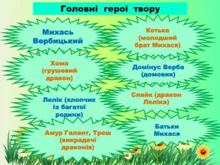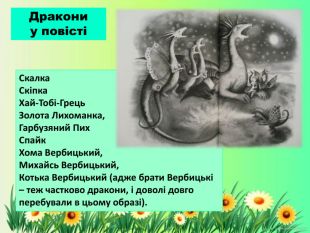 «Дракони, вперед!»2 Частини 39 розділів. Ознаки фантастичного твору. Фантастичні персонажіЧарівні перетворення. Грушевий дракон Хома, хижий дракон Спайк, інші дракони, Домінус Верба,ельфи та прялі в ботанічному саду,Шпак Музика та його онука Альфа Бетельгейзе. З насінинки драконячого дерева виростає грушевий дракон Хома. Дракони перетворюються на собак. Михась та Котька на деякий час перетворилися на драконів.