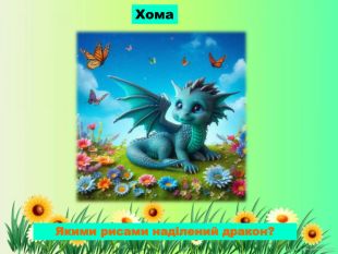Авторка повісті дібрала драконам цікаві імена. Хома в перекладі з грецької — «близнюк». Спайк з англійської —«шип». Також є дракони Хай-Тобі-Грець, Гарбузяний Пих, Золота Лихоманка, лимонні близнючки Скалка й Скіпка. https://wordwall.net/uk/resource/83582603/%d0%b4%d1%80%d0%b0%d0%ba%d0%be%d0%bd%d0%b8-%d0%b2%d0%bf%d0%b5%d1%80%d0%b5%d0%b4 Спробуй відгадати!