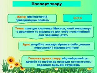 Паспорт твору Жанр: фантастична пригодницька повість. Головна думка твору: відповідальність, дружба та любов до природи допомагають подолати будь-які труднощі. Тема: пригоди хлопчика Михася, який товаришує з драконом та відкриває для себе незвичайний світ чарівних істот. Ідея: потрібно завжди вірити в себе, долати перешкоди і відкривати нове2014