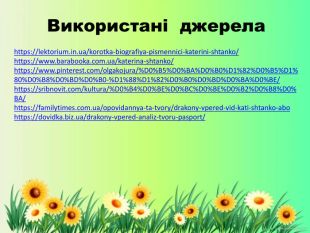 https://lektorium.in.ua/korotka-biografiya-pismennici-katerini-shtanko/https://www.barabooka.com.ua/katerina-shtanko/https://www.pinterest.com/olgakojura/%D0%B5%D0%BA%D0%B0%D1%82%D0%B5%D1%80%D0%B8%D0%BD%D0%B0-%D1%88%D1%82%D0%B0%D0%BD%D0%BA%D0%BE/https://sribnovit.com/kultura/%D0%B4%D0%BE%D0%BC%D0%BE%D0%B2%D0%B8%D0%BA/https://familytimes.com.ua/opovidannya-ta-tvory/drakony-vpered-vid-kati-shtanko-abohttps://dovidka.biz.ua/drakony-vpered-analiz-tvoru-pasport/Використані джерела