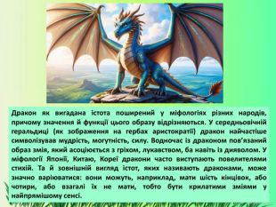 Дракон як вигадана істота поширений у міфологіях різних народів, причому значення й функції цього образу відрізняються. У середньовічній геральдиці (як зображення на гербах аристократії) дракон найчастіше символізував мудрість, могутність, силу. Водночас із драконом пов’язаний образ змія, який асоціюється з гріхом, лукавством, ба навіть із дияволом. У міфології Японії, Китаю, Кореї дракони часто виступають повелителями стихій. Та й зовнішній вигляд істот, яких називають драконами, може значно варіюватися: вони можуть, наприклад, мати шість кінцівок, або чотири, або взагалі їх не мати, тобто бути крилатими зміями у найпрямішому сенсі.