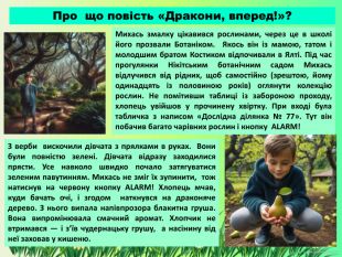 Про що повість «Дракони, вперед!»?Михась змалку цікавився рослинами, через це в школі його прозвали Ботаніком. Якось він із мамою, татом і молодшим братом Костиком відпочивали в Ялті. Під час прогулянки Нікітським ботанічним садом Михась відлучився від рідних, щоб самостійно (зрештою, йому одинадцять із половиною років) оглянути колекцію рослин. Не помітивши таблиці із забороною проходу, хлопець увійшов у прочинену хвіртку. При вході була табличка з написом «Дослідна ділянка № 77». Тут він побачив багато чарівних рослин і кнопку ALARM! З верби вискочили дівчата з прялками в руках. Вони були повністю зелені. Дівчата відразу заходилися прясти. Усе навколо швидко почало затягуватися зеленим павутинням. Михась не зміг їх зупинити, тож натиснув на червону кнопку ALARM! Хлопець мчав, куди бачать очі, і згодом наткнувся на драконяче дерево. З нього випала напівпрозора блакитна груша. Вона випромінювала смачний аромат. Хлопчик не втримався — і з’їв чудернацьку грушу, а насінину від неї заховав у кишеню.
