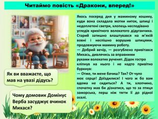 Якось посеред дня у маминому кошику, куди вона складала мотки ниток, шпиці і недоплетені светри, хлопець несподівано угледів крихітного волохатого дідуганчика. Старий затишно влаштувався на м’якій вовні і неспішно ворушив шпицями, продовжуючи мамину роботу.— Добрий вечір, — розгублено привітався Михась, дивлячись за вправними рухами волохатих рученят. Дідок гостро кліпнув на нього і не надто привітно буркнув:— Отже, ти мене бачиш? Так? От чуло моє серце! Доїздилися! І чого ж бо вам вдома не сидиться? А ти, хлопчино, спочатку мав би дізнатися, що то за птиця заморська, перш ніж тягти її до рідної оселі. Як ви вважаєте, що мав на увазі дідусь?Читаймо повість «Дракони, вперед!»Чому домовик Домінус Верба засуджує вчинок Михася?
