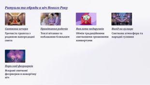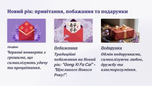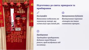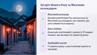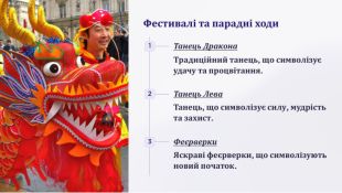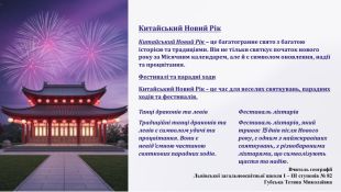 Китайський Новий Рік. Китайський Новий Рік – це багатогранне свято з багатою історією та традиціями. Він не тільки святкує початок нового року за Місячним календарем, але й є символом оновлення, надії та процвітання. Фестивалі та парадні ходи. Китайський Новий Рік - це час для веселих святкувань, парадних ходів та фестивалів. Танці драконів та левів. Традиційні танці драконів та левів є символом удачі та процвітання. Вони є невід'ємною частиною святкових парадних ходів. Фестиваль ліхтарів. Фестиваль ліхтарів, який триває 15 днів після Нового року, є одним з найяскравіших святкувань, з різнобарвними ліхтарями, що символізують щастя та надію. Вчитель географії Львівської загальноосвітньої школи І – ІІІ ступенів № 82 Губська Тетяна Миколаївна
