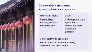 Символічне значення традиційних святкувань. Червоний колір. Символізує щастя, удачу та процвітання. ВогніВідлякують злих духів та символізують надію та радість. Танці драконів та левів. Вважаються символом сили, мудрості та достатку.