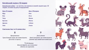 Китайський зодіак з 12 тварин. Китайський зодіак — це система, яка приписує кожній людині одну з 12 тварин, залежно від року її народження. Цикл 12 тварин. Щур. Бик. Тигр. Кролик. Дракон. Змія. Цикл 12 тварин. Кінь. Коза. Мавпа. Півень. Собака. Свиня. Святкова їжа та її символіка8 ПроцвітанняЇдять 8 видів страв, що символізують достаток та щастя.9 Довголіття. Довгі макарони, що символізують довгий і щасливий життєвий шлях.1 Об'єднання. Цільний фрукт, що символізує єдність та гармонію.