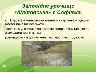 Заповідне урочище «Кіліповське» с Софіївка. с. Покровка – мальовнича комплексна ділянка – бувший маєток пана Кіліповського. Територія урочища являє собою погорбовану місцевість з виходами гранітів, яка розміщується в долині невеликої протоки р. Сугоклеї.