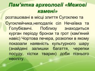 Пам’ятка археології «Межові камені» розташовані в місці злиття Сугоклею та Сугоклейчика,неподалік сіл Нечаївка та Голубієвичі. Поблизу знаходиться курган періоду бронзи та грот (кам'яний навіс) Чортова печера, розкопки в якому показали наявність культурного шару (знайдені залишки багаття, черепки посуду, кістки тварин) доби пізнього неоліту.