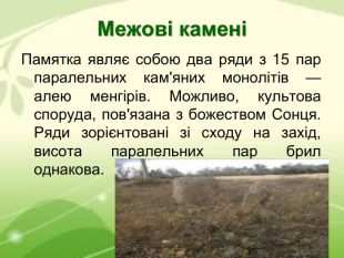 Межові камені Памятка являє собою два ряди з 15 пар паралельних кам'яних монолітів — алею менгірів. Можливо, культова споруда, пов'язана з божеством Сонця. Ряди зорієнтовані зі сходу на захід, висота паралельних пар брил однакова.
