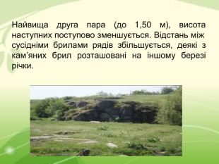 Найвища друга пара (до 1,50 м), висота наступних поступово зменшується. Відстань між сусідніми брилами рядів збільшується, деякі з кам’яних брил розташовані на іншому березі річки.
