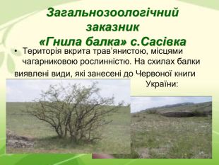 Загальнозоологічний заказник «Гнила балка» с.Сасівка Територія вкрита трав’янистою, місцями чагарниковою рослинністю. На схилах балки виявлені види, які занесені до Червоної книги України:
