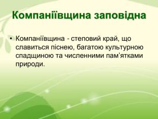 Компаніївщина заповідна Компаніївщина - степовий край, що славиться піснею, багатою культурною спадщиною та численними пам’ятками природи.