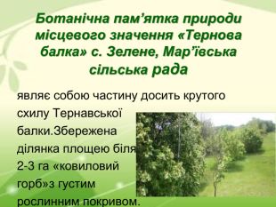 Ботанічна пам’ятка природи місцевого значення «Тернова балка» с. Зелене, Мар’ївська сільська рада являє собою частину досить крутого схилу Тернавської балки.Збережена ділянка площею біля 2-3 га «ковиловий горб»з густим рослинним покривом.