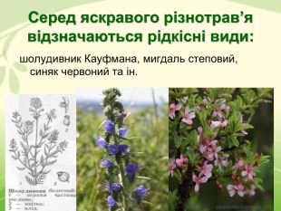 Серед яскравого різнотрав’я відзначаються рідкісні види: шолудивник Кауфмана, мигдаль степовий, синяк червоний та ін.