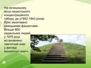 На колишньому місці нацистського концентраційного табору, де у1942-1943 роках було закатовано німецькими фашистами більше 800 радянських людей, у 1975 році встановлено пам’ятний знак у вигляді монолітної плити