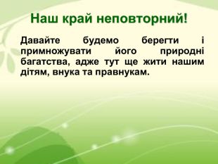 Наш край неповторний! Давайте будемо берегти і примножувати його природні багатства, адже тут ще жити нашим дітям, внука та правнукам.