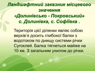 Ландшафтний заказник місцевого значення «Долинівсько - Покровський» с. Долинівка, с. Софіївка . Територія цієї ділянки являє собою верхів’я досить глибокої балки з водотоком по днищу системи річки Сугоклей. Балка тягнеться майже на 10 км. З загальним ухилом до річки.
