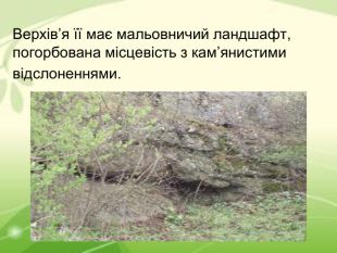 Верхів’я її має мальовничий ландшафт, погорбована місцевість з кам’янистими відслоненнями.