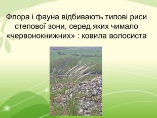 Флора і фауна відбивають типові риси степової зони, серед яких чимало «червонокнижних» : ковила волосиста