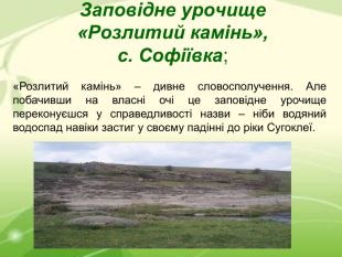 Заповідне урочище «Розлитий камінь», с. Софіївка; «Розлитий камінь» – дивне словосполучення. Але побачивши на власні очі це заповідне урочище переконуєшся у справедливості назви – ніби водяний водоспад навіки застиг у своєму падінні до ріки Сугоклеї.
