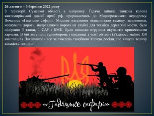 26 лютого – 3 березня 2022 року. З території Сумської області в напрямку Гадяча зайшла танкова колона кантемирівської дивізії армії рф, прориваючись до Миргородського аеродрому. Почалось «Гадяцьке сафарі». Місцеве населення підпалювало техніку, заправники, маскували дороги, направляючи ворога на слабкі для техніки дерев’яні мости, було підірвано 3 танки, 1 САУ і БМП. Були випадки отруєння окупантів принесеними харчами. В бій вступили терооборона і мисливці з усієї області (з’їхалось майже 150 мисливців). Закінчилось все за тиждень ганебною втечею росіян, що кинули велику кількість техніки.
