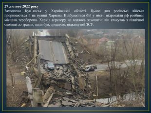 27 лютого 2022 року. Захоплено Куп’янськ у Харківській області. Цього дня російські війська прориваються й на вулиці Харкова. Відбувається бій у місті: підрозділи рф розбиває місцева тероборона. Харків агресору не вдалось захопити: він атакував з північної околиці до травня, коли був, зрештою, відкинутий ЗСУ.
