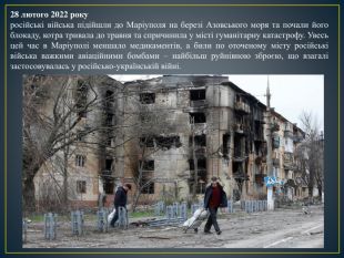 28 лютого 2022 рокуросійські війська підійшли до Маріуполя на березі Азовського моря та почали його блокаду, котра тривала до травня та спричинила у місті гуманітарну катастрофу. Увесь цей час в Маріуполі меншало медикаментів, а били по оточеному місту російські війська важкими авіаційними бомбами – найбільш руйнівною зброєю, що взагалі застосовувалась у російсько-українській війні.
