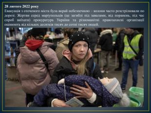 28 лютого 2022 року. Евакуація з оточеного міста була вкрай небезпечною – колони часто розстрілювали по дорозі. Жертви серед маріупольців (це загиблі під завалами, від поранень, під час спроб виїхати) прокуратура України та різноманітні правозахисні організації оцінюють від кількох десятків тисяч до сотні тисяч людей.