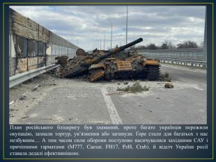 План російського бліцкригу був зламаний, проте багато українців пережили окупацію, зазнали тортур, ув’язнення або загинули. Горе стало для багатьох з нас незбувним… А тим часом сили оборони поступово насичувалися західними САУ і причіпними гарматами (М777, Caesar, FH17, Pz. H, Crab), й відсіч України росії ставала дедалі ефективнішою.