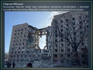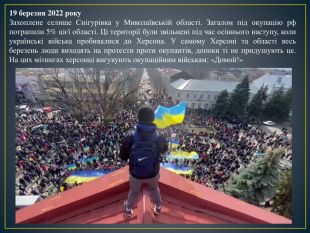 19 березня 2022 року. Захоплене селище Снігурівка у Миколаївській області. Загалом під окупацію рф потрапили 5% цієї області. Ці території були звільнені під час осіннього наступу, коли українські війська пробивалися до Херсона. У самому Херсоні та області весь березень люди виходять на протести проти окупантів, допоки ті не придушують це. На цих мітингах херсонці вигукують окупаційним військам: «Домой!»
