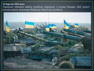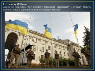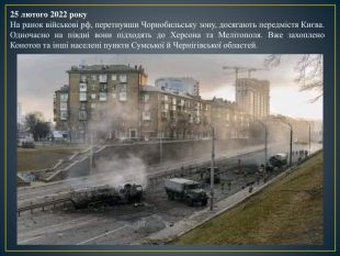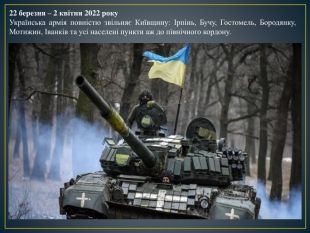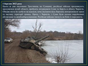 1 березня 2022 року. Цього ж дня окуповано Тростянець на Сумщині, російські війська продовжують просуватися вглиб області, пробують штурмувати Суми та беруть в облогу Чернігів. Обидва міста їм здобути на вдалося, хоча окупанти весь березень контролювали траси та частину території громад. Проте, і Чернігів, і Суми були сильно поруйновані обстрілами та авіабомбардуваннями. Російські війська тиснуть на Київ із передмість.