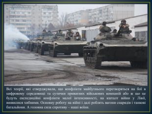 Всі теорії, які стверджували, що конфлікти майбутнього перетворяться на бої в цифровому середовищі та сутички приватних військових компаній або ж що це будуть експедиційні конфлікти малої інтенсивності, на кшталт війни у Лівії, виявилися хибними. Основну роботу на війні і далі роблять вагони снарядів і танкові батальйони. А головна сила спротиву – наші воїни.