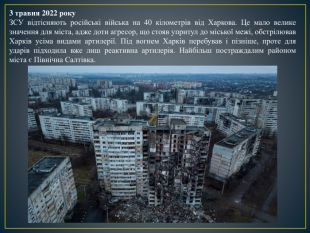 3 травня 2022 року. ЗСУ відтісняють російські війська на 40 кілометрів від Харкова. Це мало велике значення для міста, адже доти агресор, що стояв упритул до міської межі, обстрілював Харків усіма видами артилерії. Під вогнем Харків перебував і пізніше, проте для ударів підходила вже лиш реактивна артилерія. Найбільш постраждалим районом міста є Північна Салтівка.