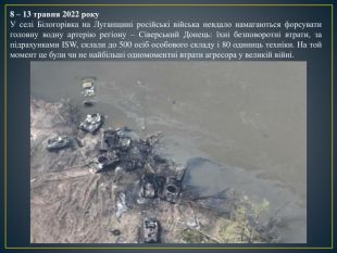 8 – 13 травня 2022 року. У селі Білогорівка на Луганщині російські війська невдало намагаються форсувати головну водну артерію регіону – Сіверський Донець: їхні безповоротні втрати, за підрахунками ISW, склали до 500 осіб особового складу і 80 одиниць техніки. На той момент це були чи не найбільші одномоментні втрати агресора у великій війні.