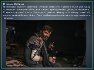 16 травня 2022 рокурф повністю окуповує Маріуполь. Останнім форпостом України у ньому став завод «Азовсталь». Захисники міста (полк «Азов», прикордонники, Донецька тероборона, 36 бригада морської піхоти, Нацгвардія) тримали оборону в оточеному заводі під ударами авіабомб більше місяця. Разом із військовими на «Азовсталі» переховувались і цивільні.