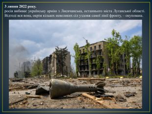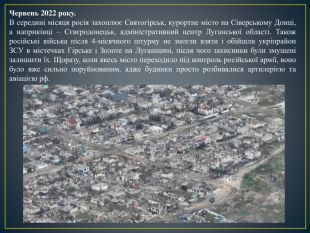Червень 2022 року. В середині місяця росія захоплює Святогірськ, курортне місто на Сіверському Донці, а наприкінці – Сєвєродонецьк, адміністративний центр Луганської області. Також російські війська після 4-місячного штурму не змогли взяти і обійшли укріпрайон ЗСУ в містечках Гірське і Золоте на Луганщині, після чого захисники були змушені залишити їх. Щоразу, коли якесь місто переходило під контроль російської армії, воно було вже сильно поруйнованим, адже будинки просто розбивалися артилерією та авіацією рф.