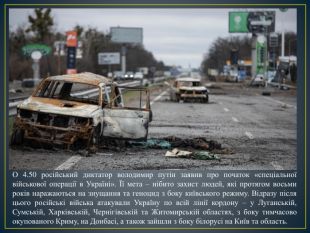 О 4.50 російський диктатор володимир путін заявив про початок «спеціальної військової операції в Україні». Її мета – нібито захист людей, які протягом восьми років наражаються на знущання та геноцид з боку київського режиму. Відразу після цього російські війська атакували Україну по всій лінії кордону – у Луганській, Сумській, Харківській, Чернігівській та Житомирській областях, з боку тимчасово окупованого Криму, на Донбасі, а також зайшли з боку білорусі на Київ та область.