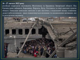 26 - 27 лютого 2022 рокуросійські підрозділи окуповують Мелітополь та Бердянськ Запорізької області. Під Києвом вони займають Бородянку, Ворзель, Бучу, Гостомель та інші населені пункти області. Евакуація цивільних жителів із цих містечок у подальший місяць ставатиме дедалі небезпечнішою: траси повнитимуться колонами та поодинокими автівками, що їх розстріляли окупанти.