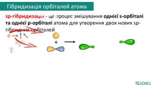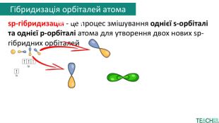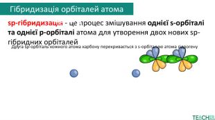 Друга sp-орбіталь кожного атома карбону перекривається з s-орбіталлю атома гідрогену. Так утворюється молекула етину та решти алкінів. Гібридизація орбіталей атома карбонуsp-гібридизація - це процес змішування однієї s-орбіталі та однієї p-орбіталі атома для утворення двох нових sp-гібридних орбіталей