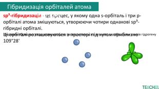 sp³-гібридизація - це процес, у якому одна s-орбіталь і три p-орбіталі атома змішуються, утворюючи чотири однакові sp³-гібридні орбіталі. Ці орбіталі розташовуються в просторі під кутом приблизно 109°28'Верхівки гібридних хмар атома карбону перекриваються з чотирма s-орбіталями атомів гідрогену. Гібридизація орбіталей атома карбону